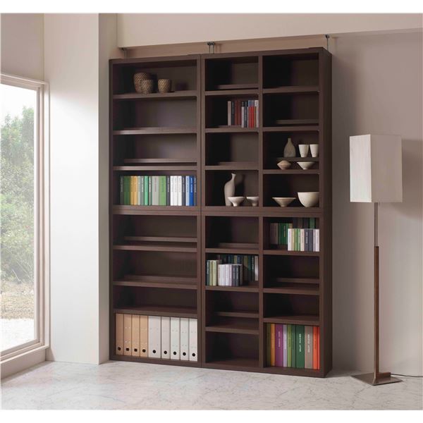 ロータイプの書棚は上下連結することができ、組み合わせ次第で天井まで届く壁面収納にもなる。