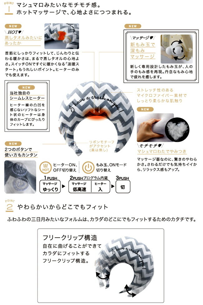 ) ※マシュマロみたいなふわふわの手触りで、首筋にしっかりフィットして、 じんわり暖かい当社独自のシームレスヒーターと新もみ玉が手もみ感覚 を再現。