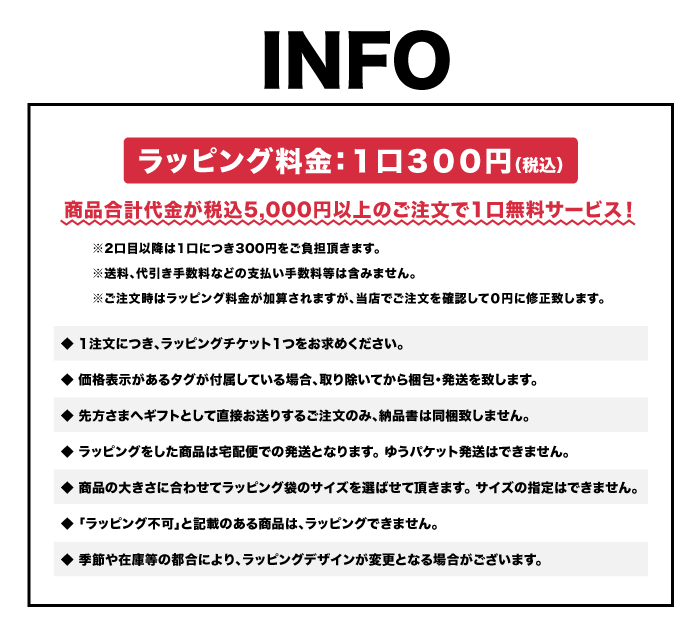 購入特典 商品合計代金が5,000円(税込)以上のご注文でラッピング1口無料。