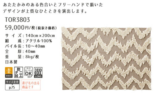 東リ ラグ おすすめアタック350(40×40)カラーフィールズTOR3818TOR3804TOR3815TOR3828 機能耐熱加工(ホットカーペット、床暖房対応)、防ダニ加工組成アクリル100%パイル長さ約10〜40mm 全厚:40mm商品名TOR3803 140×200cm ラグマットメーカー東リ 日本製ご注意ウールやアクリルに代表される紡績糸使いの商品は、繊維の特性上、遊び毛がでますのでご了承ください。