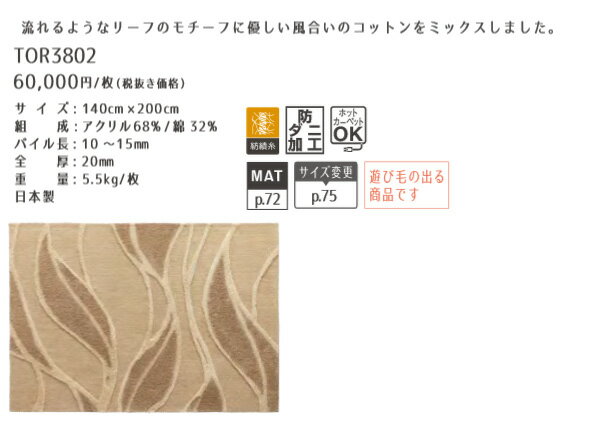 機能耐熱加工(ホットカーペット、床暖房対応)、遊び毛がでます、紡績糸、サイズオーダー可能組成アクリル68%・綿32%パイル長さ約10〜15mm 全厚:20mm商品名TOR3802 ラグマットメーカー東リ 日本製ご注意ウールやアクリルに代表される紡績糸使いの商品は、繊維の特性上、遊び毛がでますのでご了承ください。