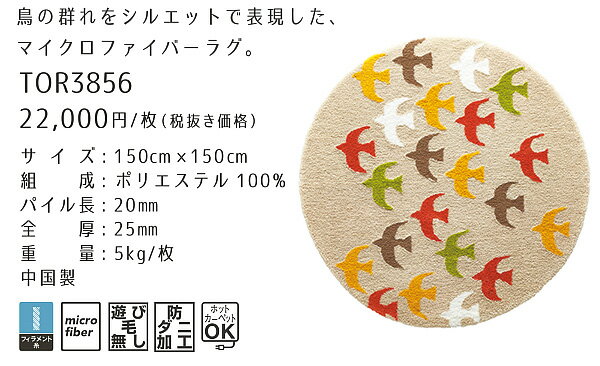 東リ ラグ おすすめアタック350(40×40)カラーフィールズTOR3856TOR3804TOR3815TOR3828 機能耐熱加工(ホットカーペット、床暖房対応)、遊び毛がでにくい組成ポリエステル100%パイル長さ約20mm 全厚:25mm商品名TOR3856 150×150cm (円形) ラグマットメーカー東リ 中国製ご注意ウールやアクリルに代表される紡績糸使いの商品は、繊維の特性上、遊び毛がでますのでご了承ください。