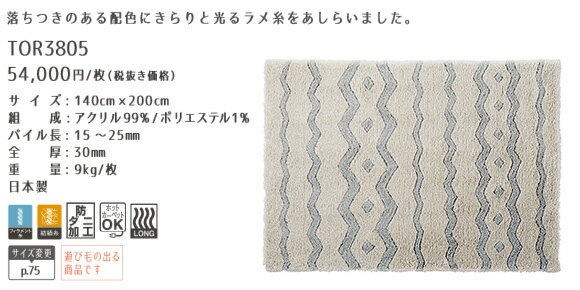 東リ ラグ おすすめアタック350(40×40)カラーフィールズTOR3818TOR3804TOR3815TOR3828 機能耐熱加工(ホットカーペット、床暖房対応)、防ダニ加工組成アクリル99% ポリエステル1%パイル長さ約15〜25mm 全厚:30mm商品名TOR3805 140×200cm ラグマットメーカー東リ 日本製ご注意ウールやアクリルに代表される紡績糸使いの商品は、繊維の特性上、遊び毛がでますのでご了承ください。